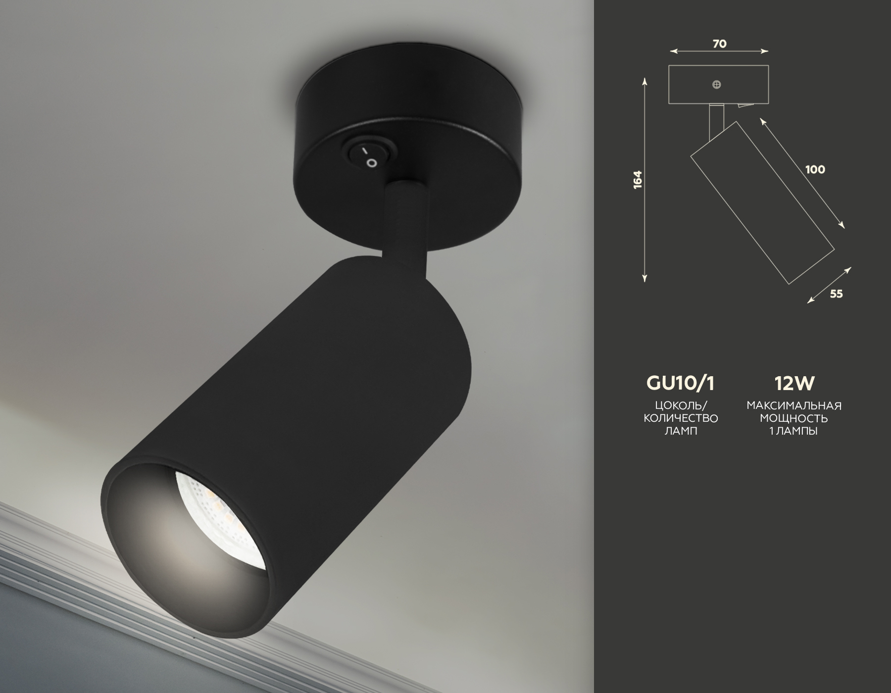 Накладной спот с выключателем TA127 BK черный GU10 max 12W D70*164*D55