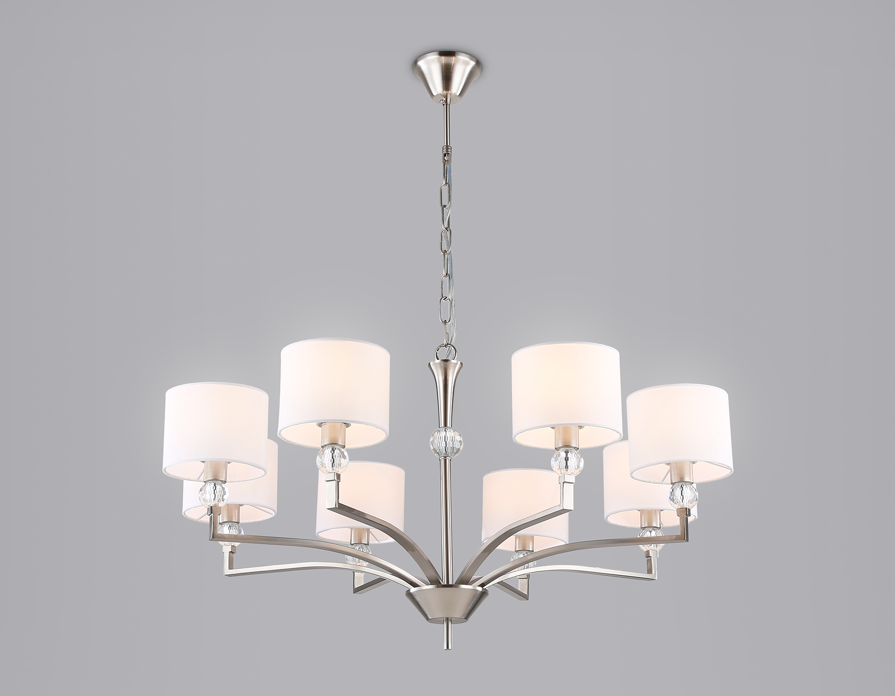 Подвесная люстра с абажурами из коллекции HIGH LIGHT. Модель LH71123 представлена в классическом стиле. Люстра выполнена из тканевых плафонов белого цвета и декорирована превосходным прозрачным хрусталем, каркас изготовлен из металла цвета никель. Для данной модели подойдут лампы с цоколем Е14. Люстра будет прекрасным дополнением в любом помещении.