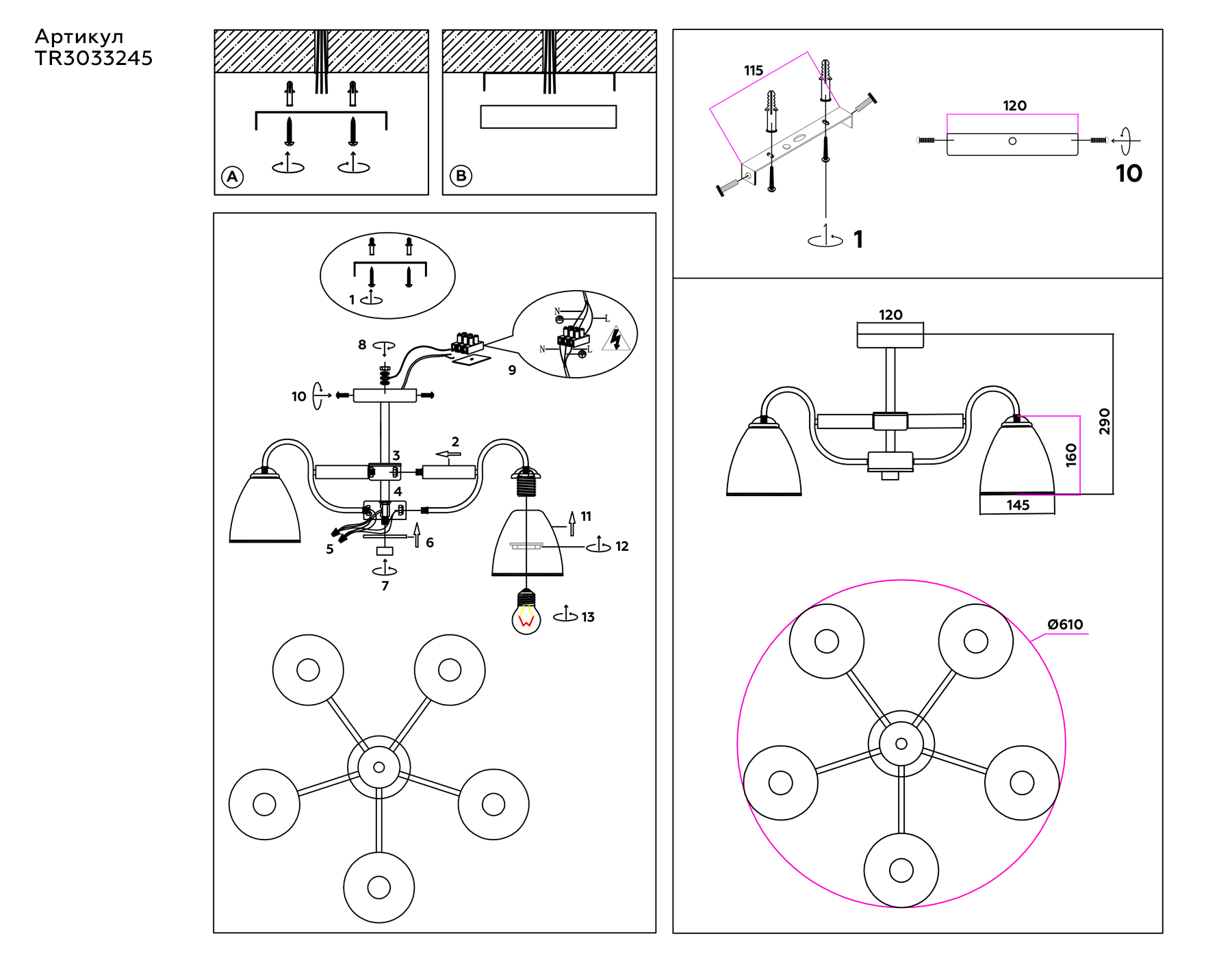 Подвесной светильник TR3033245/5 BK/CH/LW/FR черный/хром/светлое дерево/белый матовый E27*5 max 60W D610*290