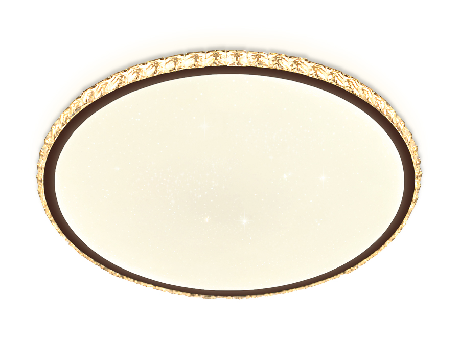 Потолочный светодиодный светильник серии ORBITAL, коллекции Crystal. Модель FF71 выполнена в современном стиле Постмодернизм. Светильник круглой формы, белого цвета, изготовлен из пластика и металлического корпуса, с граненой декоративной рамкой кофейного цвета. Благодаря встроенным в конструкцию светодиодам, вы можете с уверенностью забыть о поиске или замене дополнительных ламп. С помощью инфракрасного пульта вы сможете регулировать цветовую температуру, яркость освещения и ночной режим. Эти с