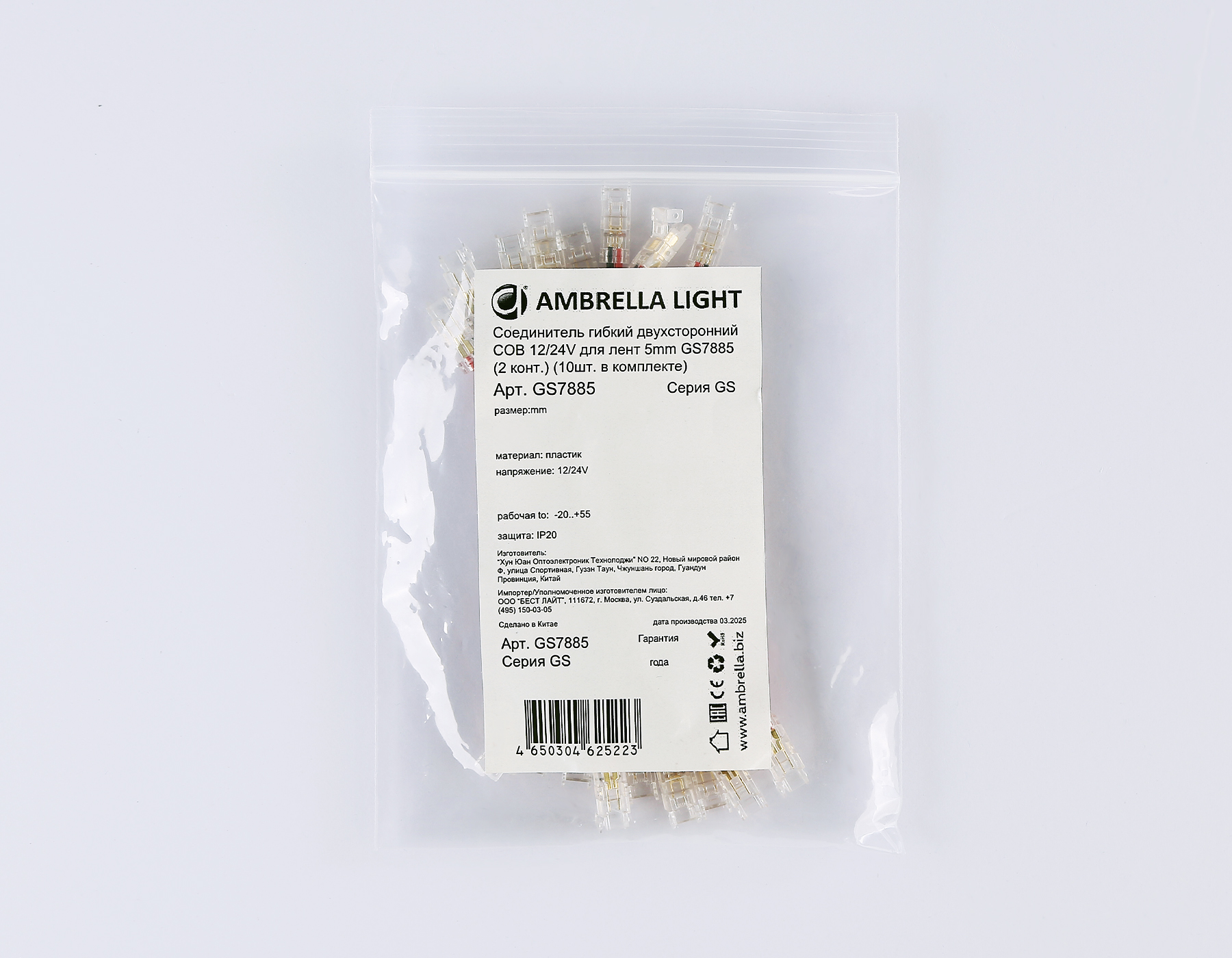 Главная страница / Каталог товаров / Соединитель гибкий двухсторонний COB 12/24V для лент 5mm GS7885 (2 конт.) (10шт. в комплекте) GS7885 Соединитель гибкий двухсторонний COB 12/24V для лент 5mm (2 конт.) (10шт)