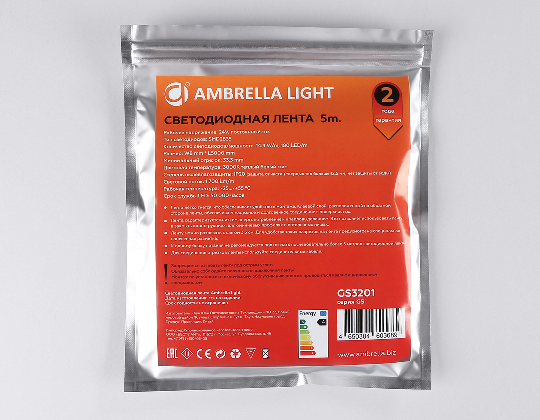 Светодиодная лента Ambrella Light GS3201 2835 180Led /14.4W m/ 24V IP20 3000K 5m GS3201 2835 180Led/ 14.4W m/ 24V IP20 3000K/ 5000*8*1.2mm (2 конт.)